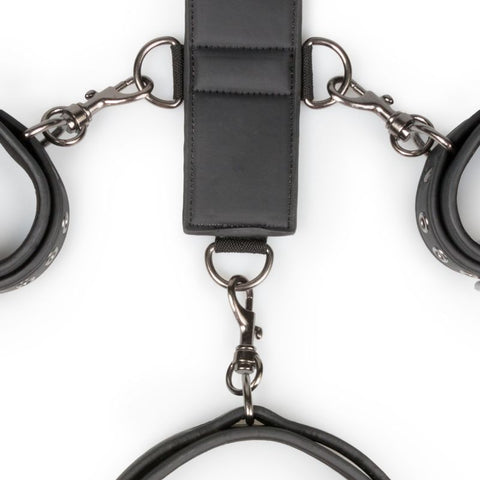 This Restraint Set Includes A Harness Strap Handcuffs And A Collar. Both The Cuffs And The Collar Are To Provide A Suitable Fit. The Components Are Made From Sturdy Faux Leather Lined With Foam To Prevent Scratching And To Allow Comfortable Use. The Bondage Strap Features Nine Small D-Rings And One Large D-Ring. The Cuffs And Collar Have Clip Fasteners That Enable Attachment To The Harness. The Length Of The Strap And The Multiple D-Rings Allow For Various Configurations To Suit Different Restraint Applications.